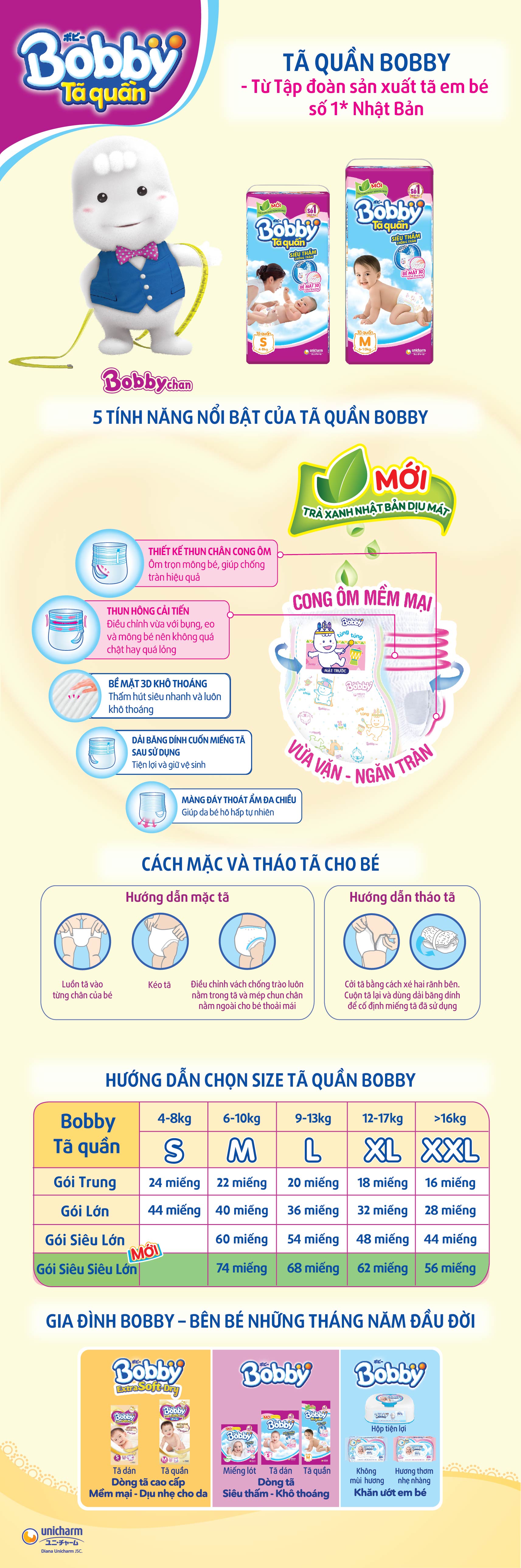 Với thun hông linh hoạt ôm vừa vặn giúp chống tràn hiệu quả cùng công nghệ siêu thấm hút và bề mặt 3D thông minh, Tã Quần Bobby Gói Cực Đại L54 đến từ Tập đoàn Unicharm (Nhật Bản) giúp bé vận động thật thoải mái và năng động để phát triển toàn diện về thể chất và trí não, cho bé những giờ phút vui chơi tự do khám phá thế giới xung quanh. Tã quần Bobby size L 54 miếng dành cho trẻ 9 - 13kg sẽ không làm mẹ thất vọng trong công việc chăm sóc sức khỏe thật tốt cho bé.