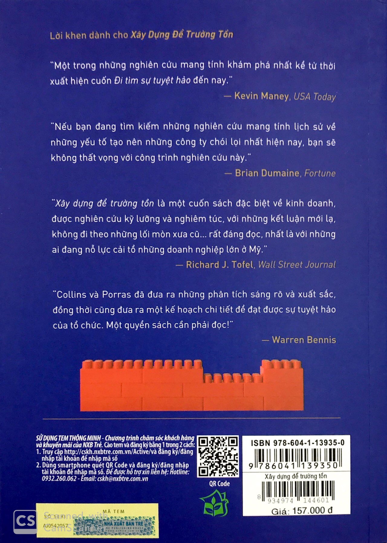 Cuốn sách được trình bày với hàng trăm ví dụ cụ thể, sinh động, sắp xếp trong một khuôn mẫu rõ ràng, nhất quán của các khái niệm thực tế, tạo điều kiện dễ dàng áp dụng cho các nhà quản trị và nhà kinh doanh ở mọi cấp độ khác nhau. Xây dựng để trường tồn - như tên gọi của nó - thực sự là một bản kế hoạch chi tiết cho việc xây dựng các tổ chức phát triển và thành công trong thế kỷ XXI.